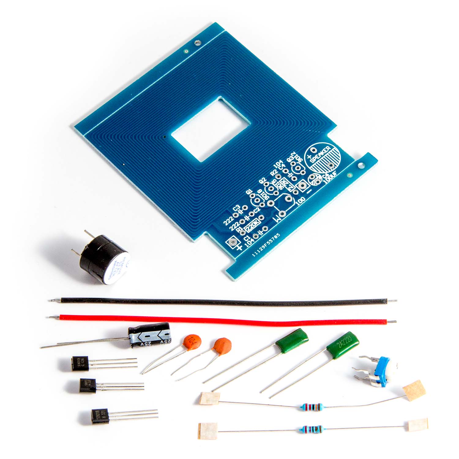 En metalldetektor som byggsats. Mycket enkel att bygga - det enda som krävs är grundläggande lödkunskaper. Byggsatsen innehåller kretskort med inbyggda detektorspolar och alla nödvändig elektroniska komponenter. Metalldetektorn har ställbar känslighet och ger ifrån sig ljudsignal när den kommer nära metallföremål. Avkänningsavståndet beror på storleken på metallföremålet, men är upp till 5 cm för stora föremål. Om man löder in en sladd till summern kan man koppla in modulen till en mikrokontroller så varför inte använda den här för att bygga en robot som letar efter borttappade föremål? Eller kanske en robot som följer en bana av ståltråd/vajer/kedja?