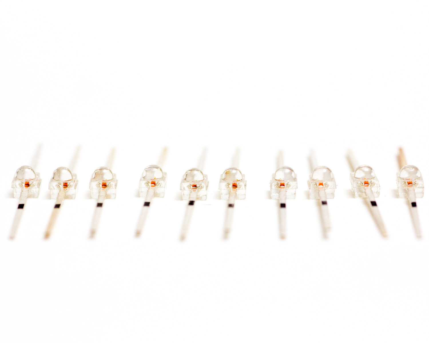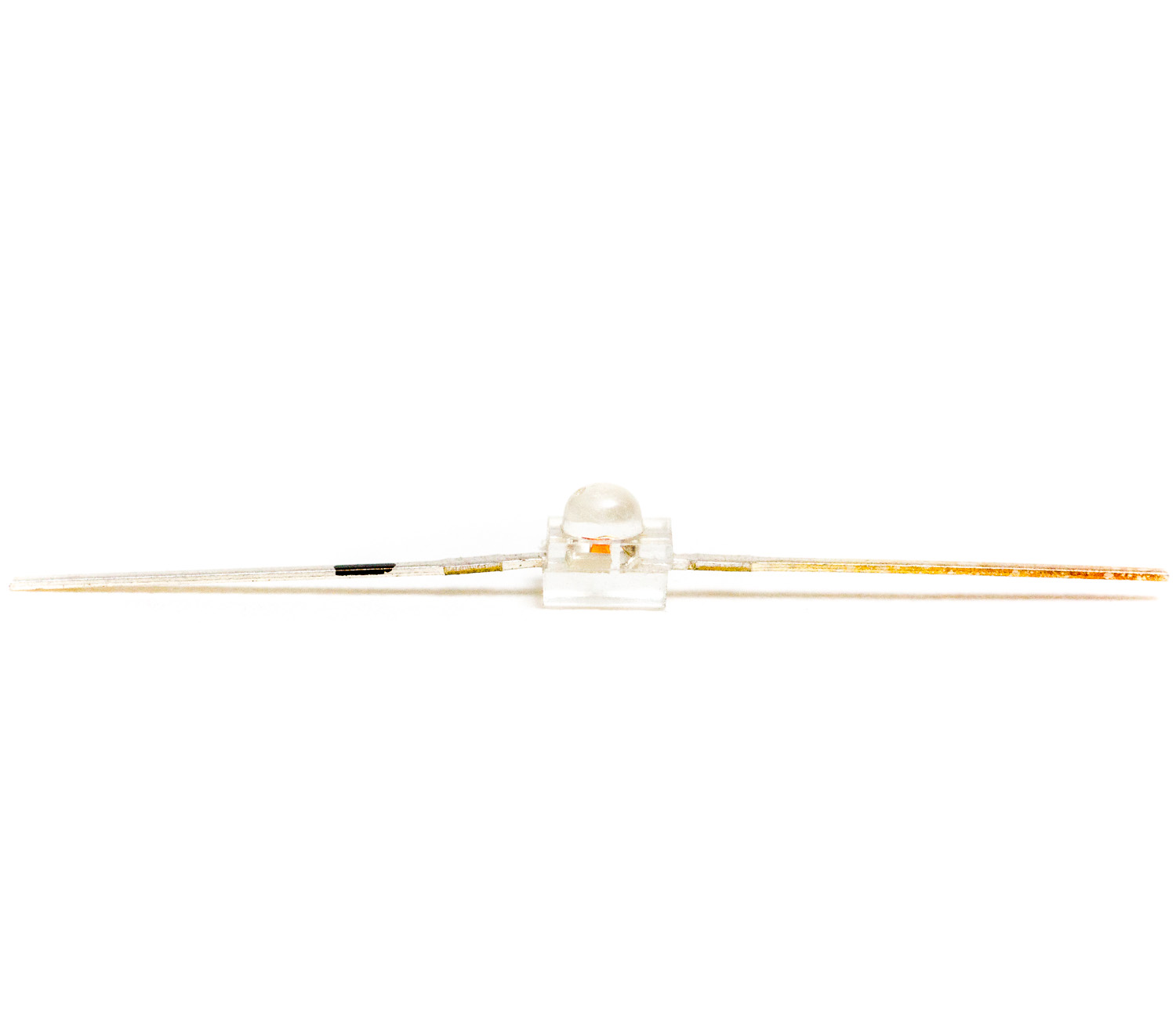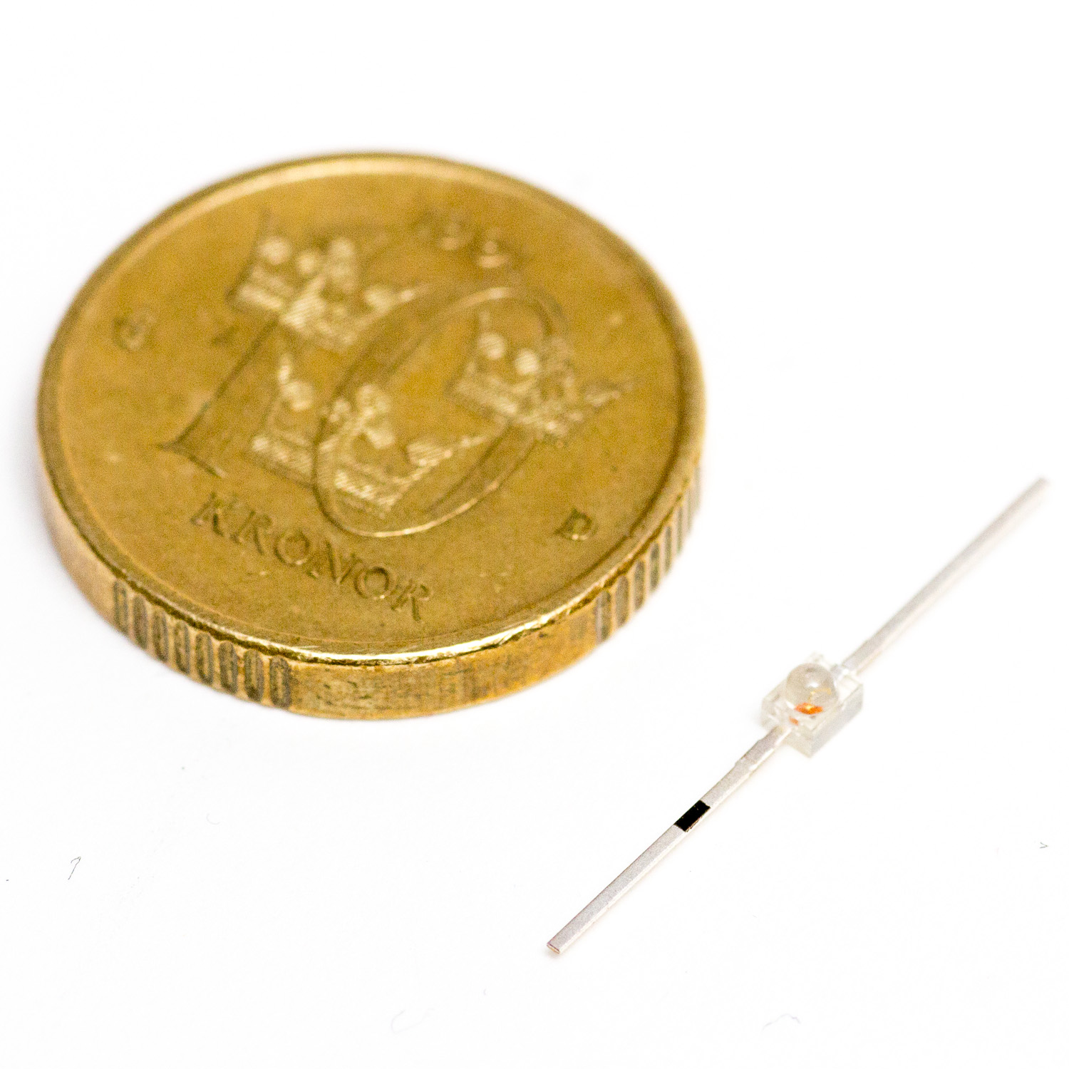Mycket liten gröna lysdiod, 1,6mm i diameter med fyrkantig bas 2,0×2,4 mm, glasklar kapsel.