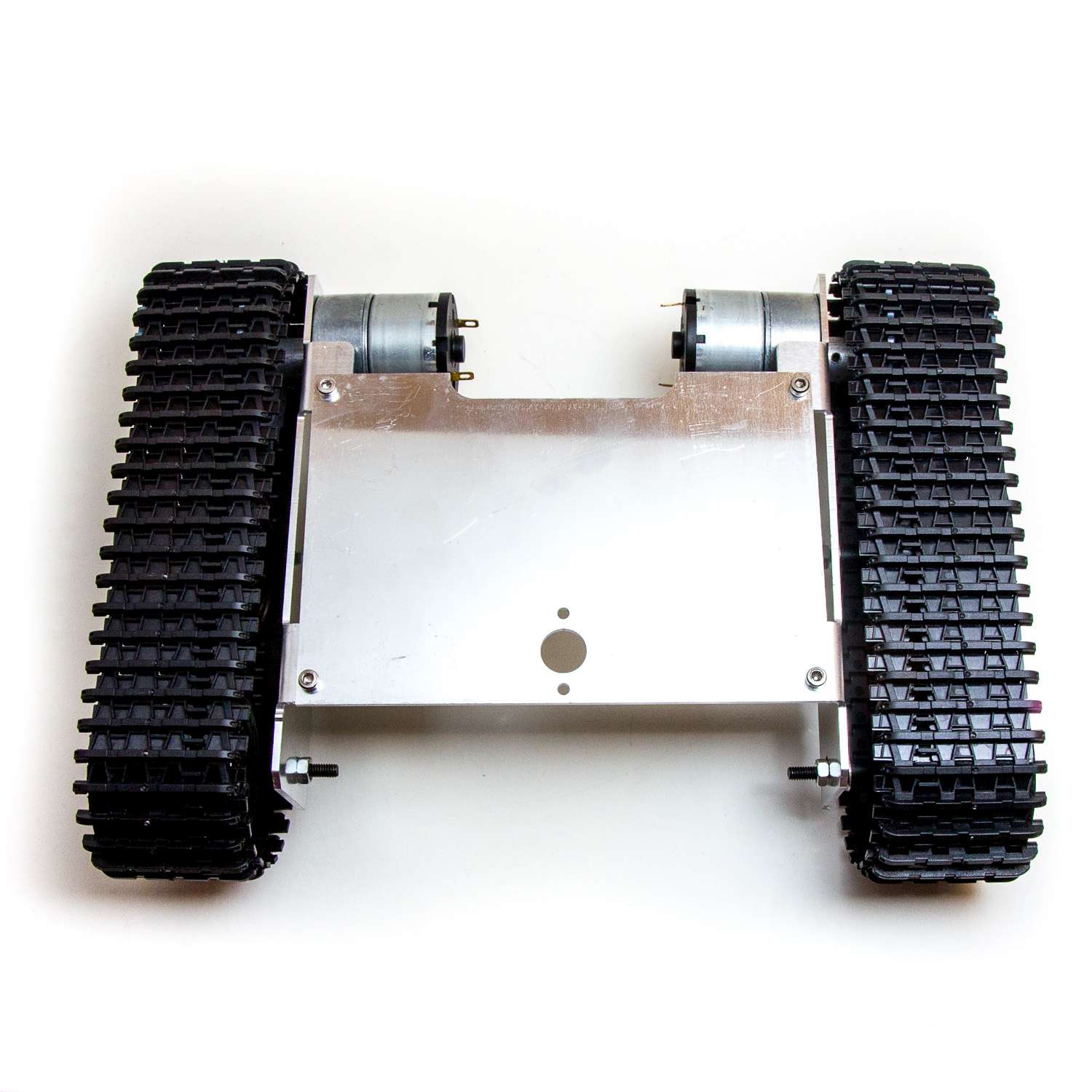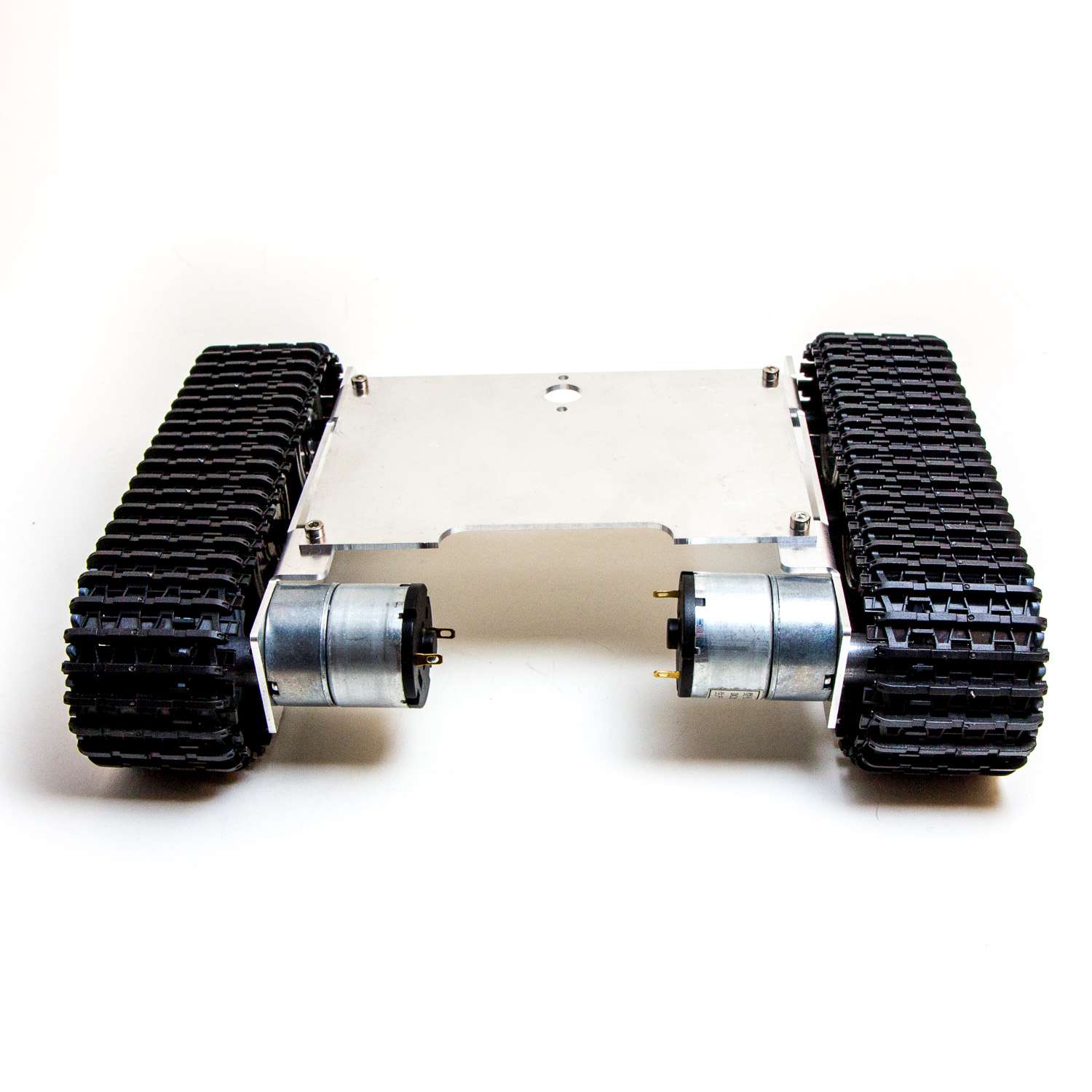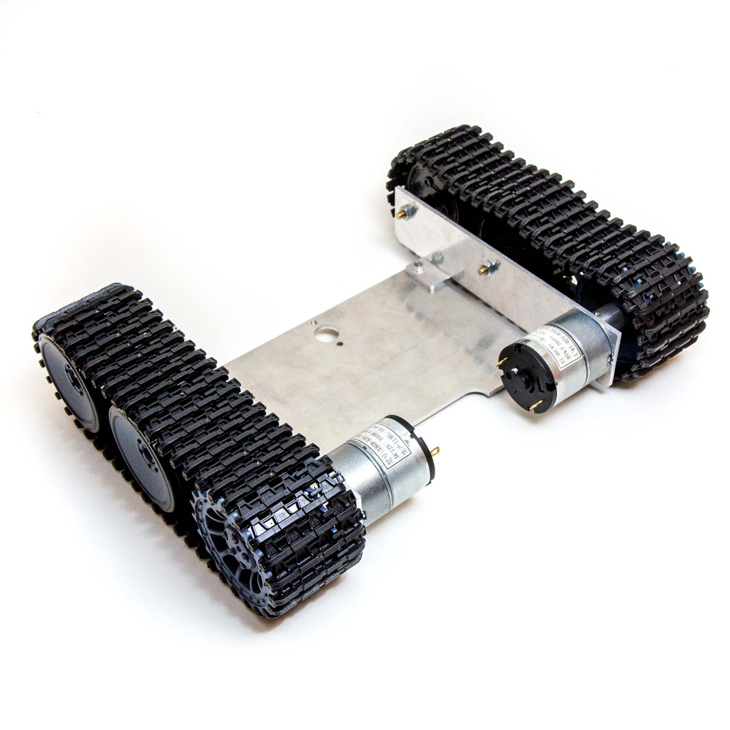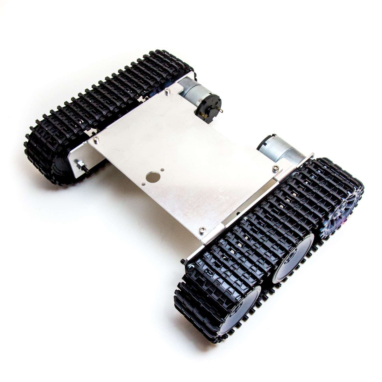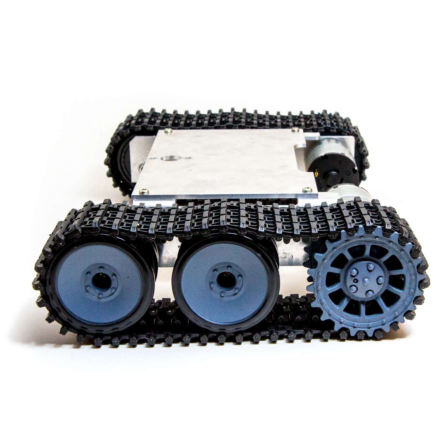 Ett stadigt robot-chassi av metall med larvfötter i hårdplast och som drivs av två mycket kraftfulla motorer. Levereras som byggsats. Maxspänning för motorerna är 12 volt.