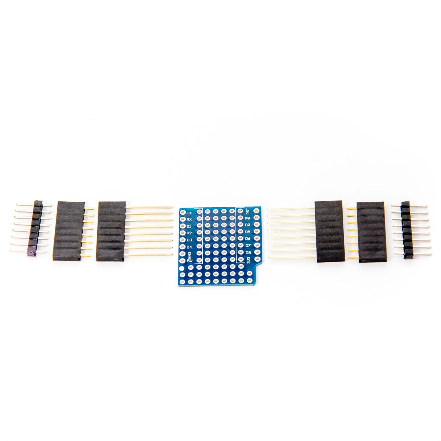 Med det här prototyp-kortet kan du skapa dina egna shields för Arduino WeMos D1 Mini. Kortet har ett rutnät av lödöar för att montera komponenter i, och alla anslutningar till WeMos-kortet finns tillgängliga längs kanterna. Tre kontakttyper medföljer så att du själv kan välja om du vill ansluta till Wemos-kortet eller andra shields ovanifrån, underifrån eller både och.
