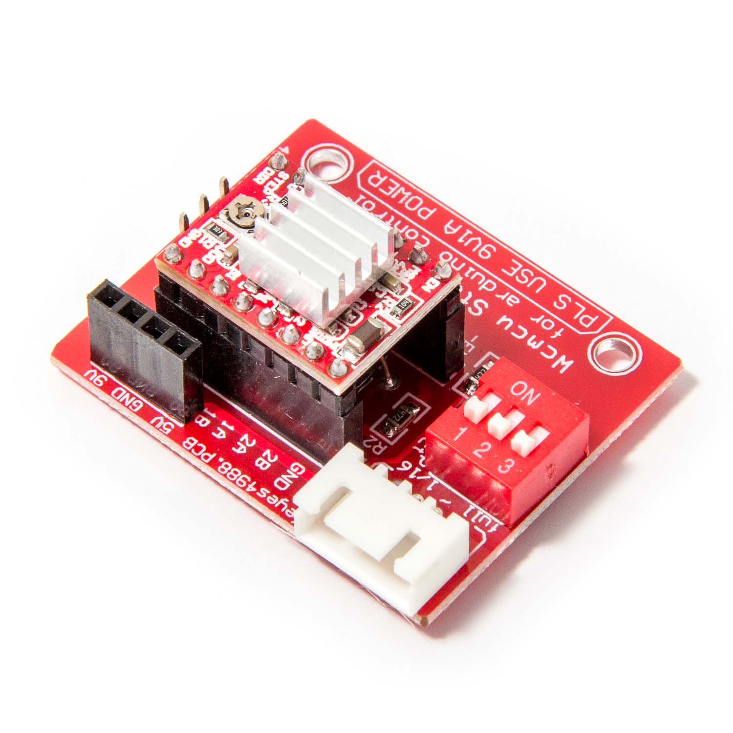 En stegmotordrivare baserad på A4988 med ett baskort för enkel anslutning.